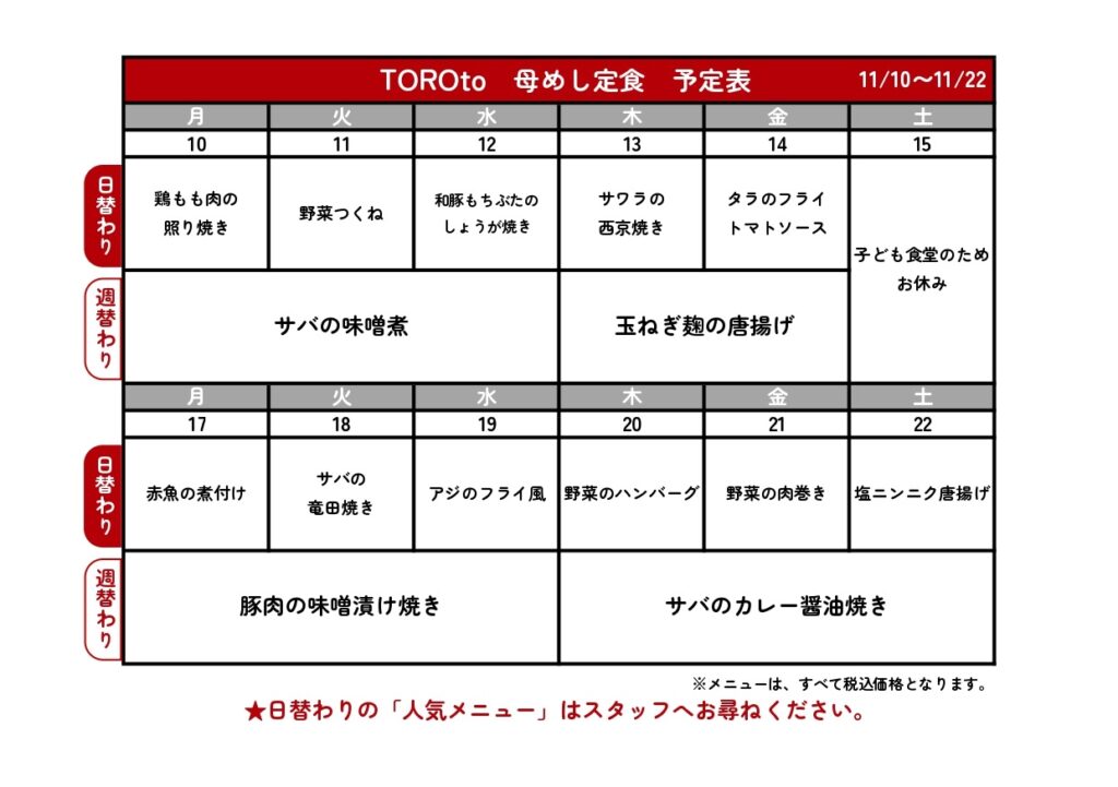 母めし定食献立予定表🌳