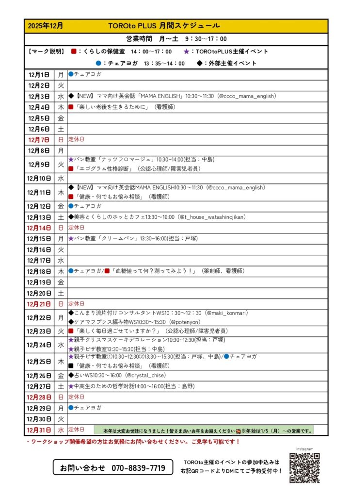 12月のTOROtoPLUSスケジュール🎄